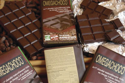 - omégachoco et chocoméga, tablettes de chocolat enrichies en oméga 3 et fibres.